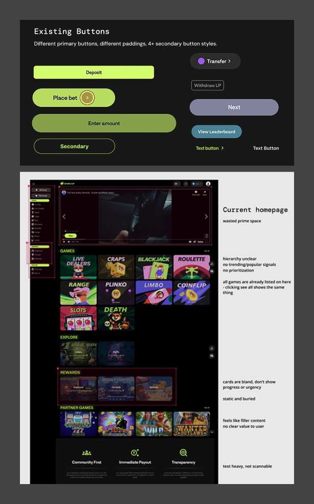 Casino games, sports betting, live table games, all on the same platform, all looking completely different. Neon buttons everywhere in different sizes and styles. Inconsistent padding. A previous designer's leftover styles that nobody was using. Developers making their own UI calls because there was nothing else to reference.