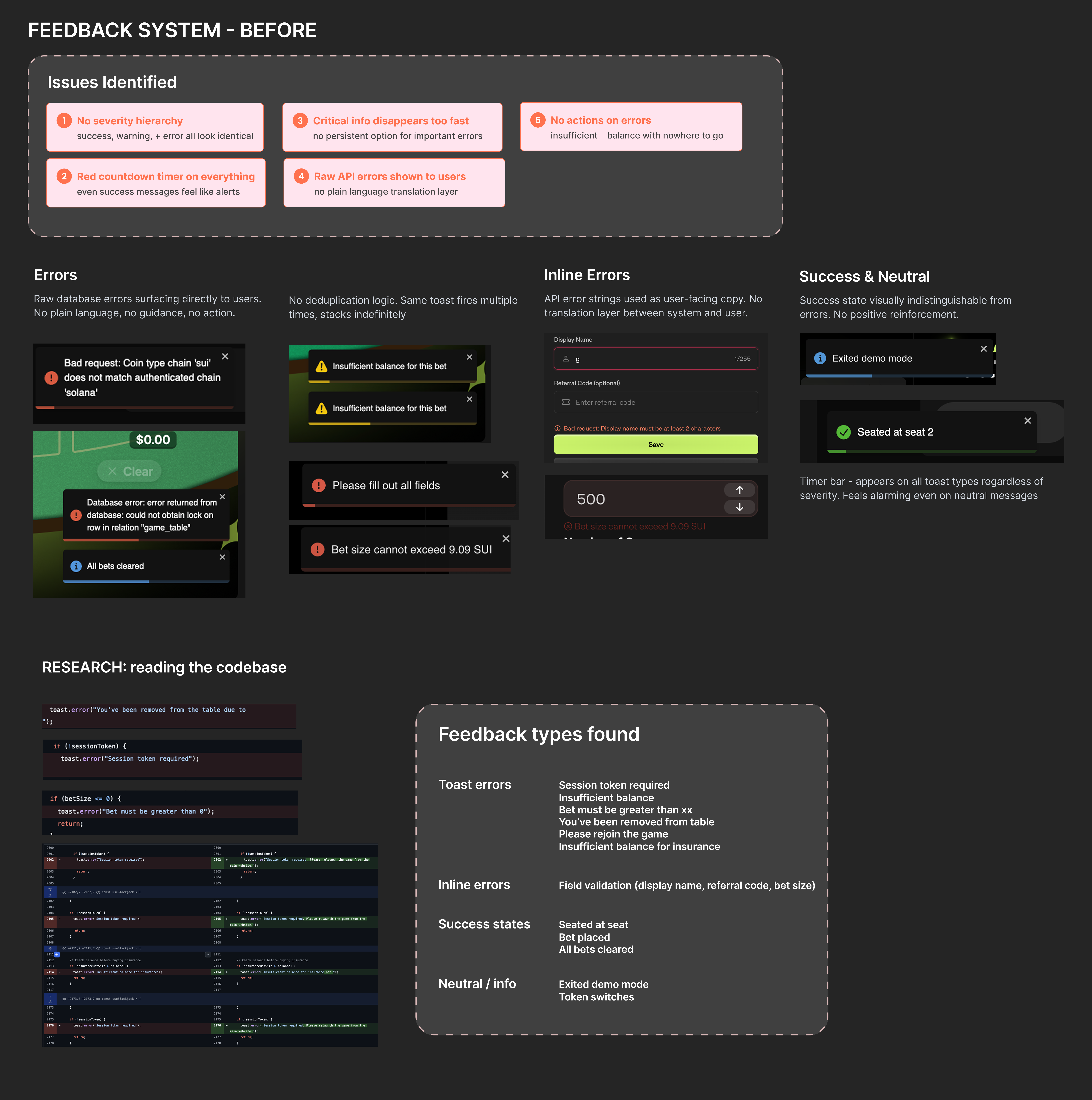 So first, I did an audit. Screenshotted every feedback state across the platform to see what existed, and then went into the codebase to find every toast.error and toast.success call. That research surfaced six distinct error types that were all being handled the same way: session errors, balance errors, field validation, neutral info, success states, all with the same styling and the same timer.